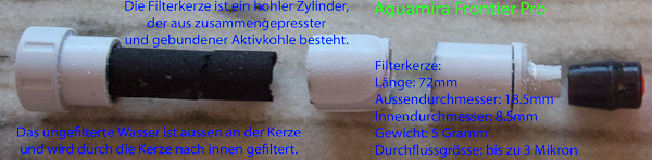 Die Filterkerze des Aquamira Frontier Pro ist ein hohler Zylinder, der aus zusammengepresster und gebundener Aktivkohle besteht. Das ungefilterte Wasser ist aussen an der Kerze und wird durch die Kerze nach innen gefiltert. Filterkerze: Länge 72mm, Aussendurchmesser 18.5mm, Innendurchmesser 8.5mm, Gewicht 5 Gramm, Durchflussgrösse bis zu 3 Mikron. Mit 3 Mikron werden nur Protozoen wie Giardia gefiltert. Bakterien oder sogar Viren passieren den Filter problemlos. Der Frontier Pro ist eher als Vorfilter und Aktivkohlefilter zu betrachten. Er soll etwa 190 Liter Wasser filtern können. Dieser Filter muss mit z.B. Micropur Forte oder einem SteriPEN kombiniert werden.